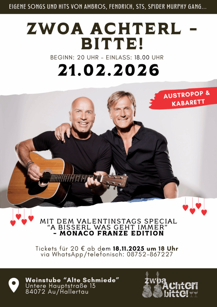 Konzertankündigung der Zwoa Achterl – bitte! am 21.02.2026: Valentinstags Special „A bisserl was geht immer“ – Monaco Franze Edition