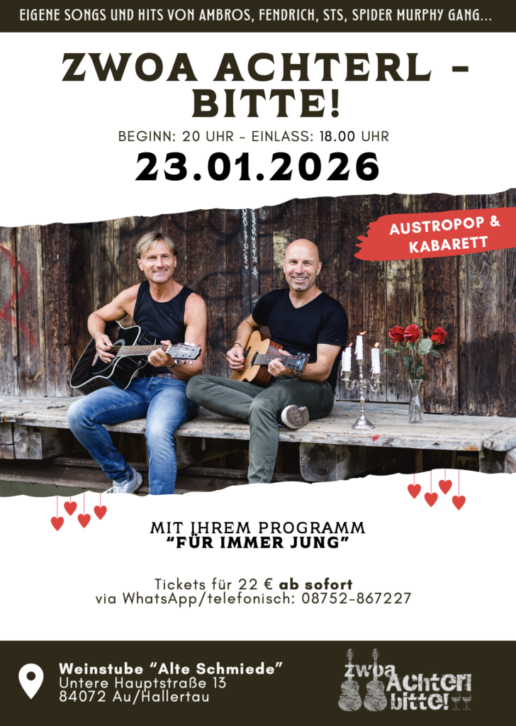 Aufgrund der großen Nachfrage spielen die Zwoa Achterl – bitte! bei uns in der Weinstube ein spontanes Konzert am 23. Januar 🎶🍷